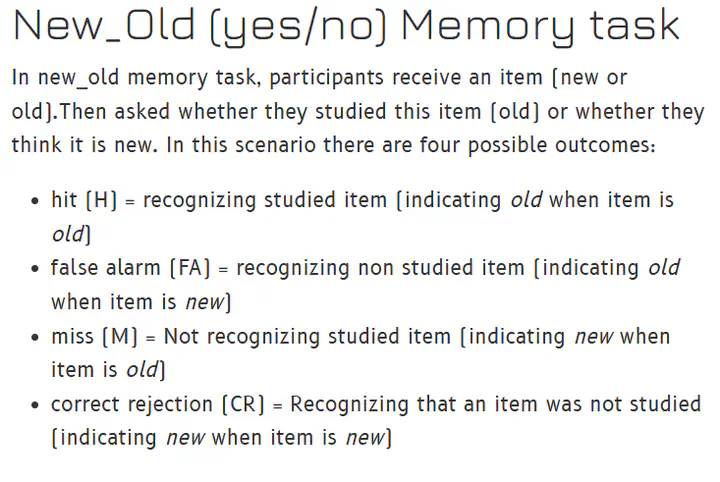 In new_old memory task, participants receive an item (new or old).Then asked whether they studied this item (old) or whether they think it is new. In this scenario there are four possible outcomes: