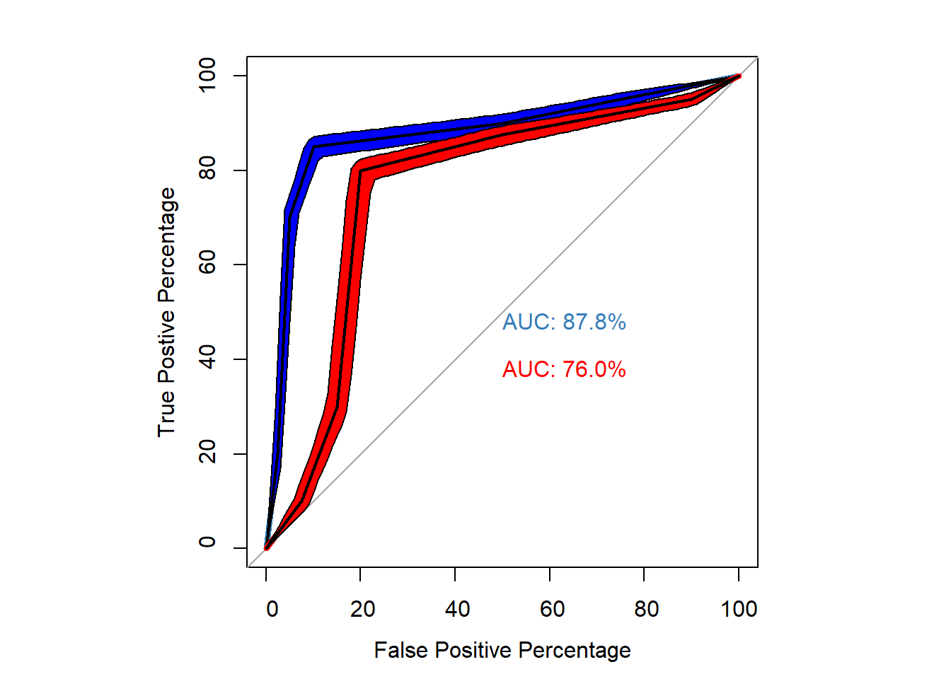 - Preferably, we plot the confidence intervals along the ROC curve to better interpret the results