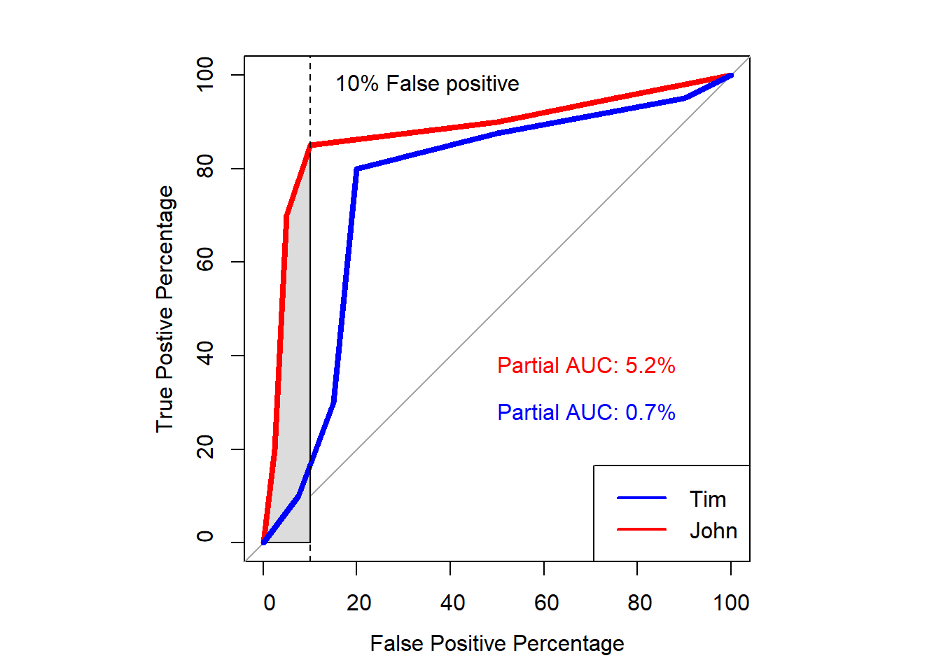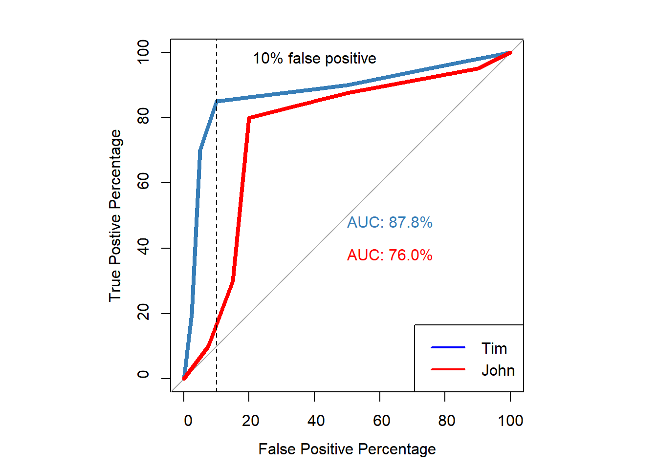 - For example, the ROC curve of Tim is greater at eacg threshold than the ROC curve of John.